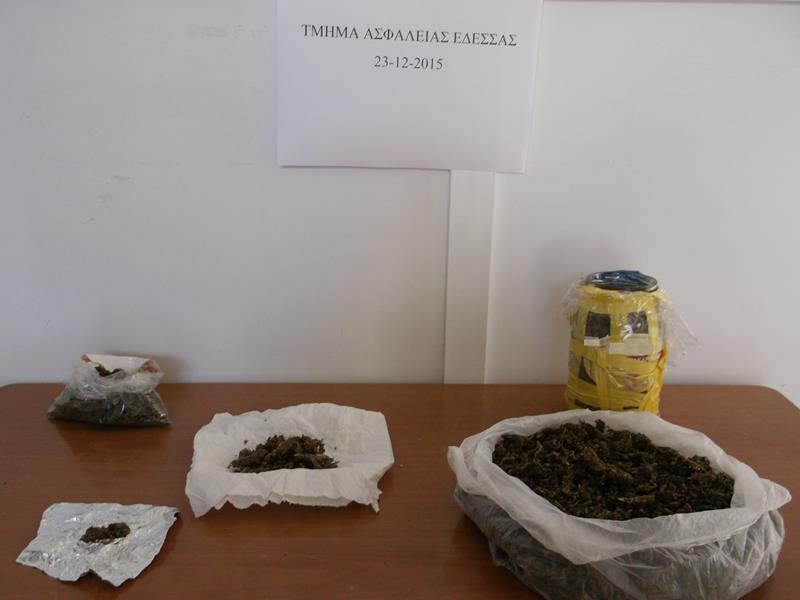 Συνελήφθη χθες (23-12-2015) το πρωί σε χωριό της Πέλλας, από αστυνομικούς της Ομάδας Δίωξης Ναρκωτικών του Τμήματος Ασφάλειας Έδεσσας, σε συνεργασία με αστυνομικούς της Ομάδας Πρόληψης και Καταστολής Εγκληματικότητας της Πέλλας, 52χρονος ημεδαπός, σε βάρος του οποίου σχηματίσθηκε δικογραφία για παραβάσεις της νομοθεσίας περί εξαρτησιογόνων ουσιών.