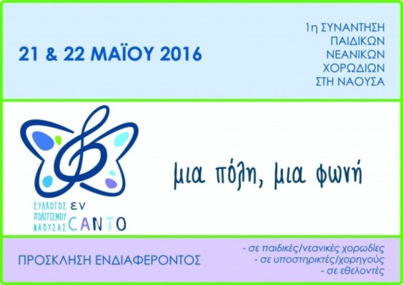 Στις 21 και 22 Μαΐου 2016 θα πραγματοποιηθεί στη Νάουσα η 1η Συνάντηση Παιδικών και Νεανικών Χορωδιών. Η πρωτοβουλία ανήκει στο νεοσύστατο Πολιτιστικό Σύλλογο Νάουσας «ενCANTO», καθώς και στη μουσικοπαιδαγωγό, Δήμητρα Μητρέντση. Στη συνάντηση αυτή έχουν ήδη προσκληθεί όλες οι χορωδίες των πολιτιστικών φορέων της Νάουσας, τέσσερις χορωδίες από τη λοιπή Ημαθία (Βέροια, Αλεξάνδρεια), καθώς και αρκετές από την υπόλοιπη Ελλάδα (Θεσσαλονίκη, Περαία, Κοζάνη, Γιαννιτσά , Χαλκιδική, Αθήνα, Πάρος κλπ). Στις εκδηλώσεις που θα πραγματοποιηθούν περιλαμβάνονται εμφανίσεις των παιδικών χορωδιών στο Δημοτικό Θέατρο, συμμετοχή δυο χορωδιών με ειδική εμφάνιση (guest), καθώς και παράλληλες εκδηλώσεις σε άλλα σημεία της πόλης, όπως party χορωδών, περιπατητική διαδρομή, παιχνίδια υπαίθρου για τους μικρούς μας φίλους κ.α. Απώτερος στόχος όλων των δράσεων είναι η επικοινωνία, η αλληλογνωριμία και αλληλεπίδραση των χορωδιών, η εξωστρέφεια και η ανάδειξη της περιοχής μας, καθώς και η συνειδητοποίηση ότι η μουσική δημιουργεί στενούς δεσμούς και προσφέρει χαρά σε μικρούς και μεγάλους.