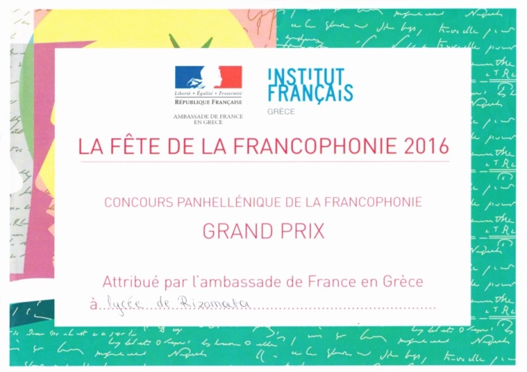 Μαθητές του Λυκείου Ριζωμάτων κέρδισαν το πρώτο βραβείο ταινίας μικρού μήκους στα Γαλλικά, στον Πανελλήνιο Διαγωνισμό Γαλλοφωνίας. Νιώθω περήφανη που παιδιά της Ημαθίας πέτυχαν μια τόσο υψηλή διάκριση και διπλά περήφανη που τα παιδιά αυτά έλκουν την καταγωγή από τον ορεινό όγκο των Πιερίων.