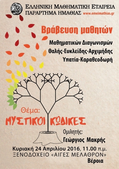 Το Παράρτημα Ημαθίας της Ελληνικής Μαθηματικής Εταιρείας βραβεύει τους μαθητές, που διακρίθηκαν στους Μαθηματικούς Διαγωνισμούς «Θαλής», «Ευκλείδης», «Αρχιμήδης», «Υπατία» και «Καραθεοδωρή», την Κυριακή 24 Απριλίου 2016 και ώρα 11:00 πμ στο Ξενοδοχείο «Αιγές Μέλαθρον» στη Βέροια.
