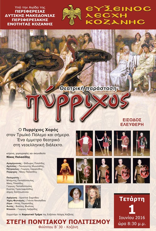 Η Εύξεινος Λέσχη Κοζάνης παρουσιάζει στη ΣΤΕΓΗ ΠΟΝΤΙΑΚΟΥ ΠΟΛΙΤΙΣΜΟΥ την θεατρική παράσταση “ΠΥΡΡΙΧΟΣ”, ο Πυρρίχιος Χορός στον Τρωϊκό Πόλεμο και σήμερα.