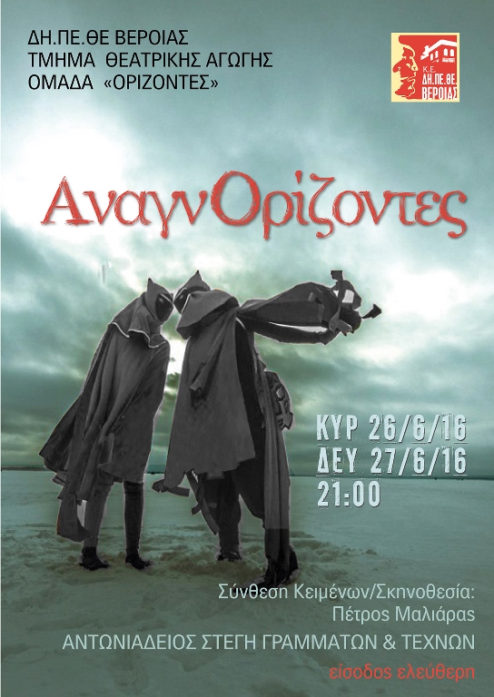 Η Ομάδα «Oμάδα «Ορίζοντες» (παιδιά Λυκείου) του Τμήματος Θεατρικής Υποδομής του ΔΗ.ΠΕ.ΘΕ. Βέροιας παρουσιάζει την παράσταση «ΑναγνΟρίζοντες» σε σκηνοθεσία Πέτρου Μαλιάρα. Η παράσταση θα δοθεί την Κυριακή 26 και τη Δευτέρα 27 Ιουνίου 2016 στις ώρα 9.00μ.μ. στην Αντωνιάδειο Στέγη Γραμμάτων & Τεχνών με ελεύθερη είσοδο.