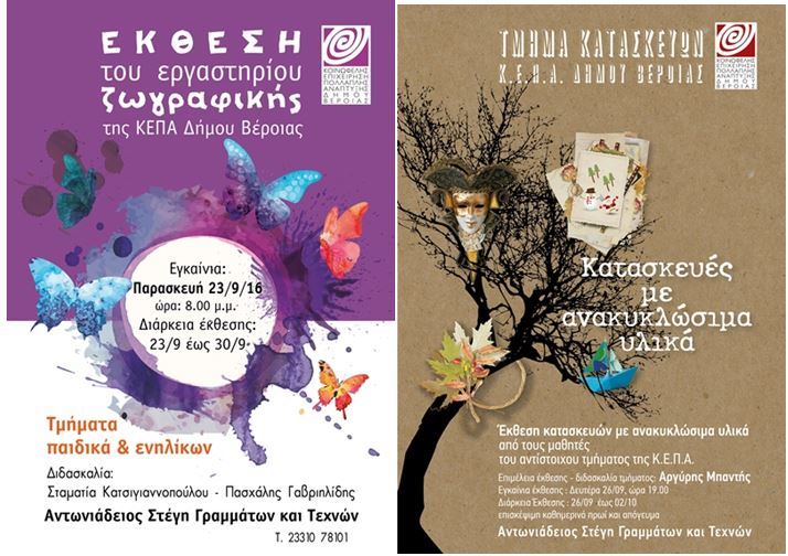 Έργα ζωγραφικής αλλά και κατασκευές από ανακυκλώσιμα υλικά , δημιουργίες των μαθητών των εκπαιδευτικών τμημάτων της Κ.Ε.Π.Α. (ΕΡΓΑΣΤΗΡΙ ΖΩΓΡΑΦΙΚΗΣ και ΤΜΗΜΑΤΑ ΚΑΤΑΣΚΕΥΩΝ) υπό την επίβλεψη και καθοδήγηση των δασκάλων τους , Σταματίας Κατσιγιαννοπούλου – Πασχάλη Γαβριηλίδη (Ζωγραφική) και Αργύρη Μπαντή (κατασκευές) θα εκτίθενται από σήμερα ως και 2/10 στο φουαγιέ της Αντωνιαδείου Στέγης Γραμμάτων και Τεχνών . Οι εκθέσεις θα λειτουργούν κάθε μέρα (εκτος Κυριακής ) πρωί και απόγευμα .
