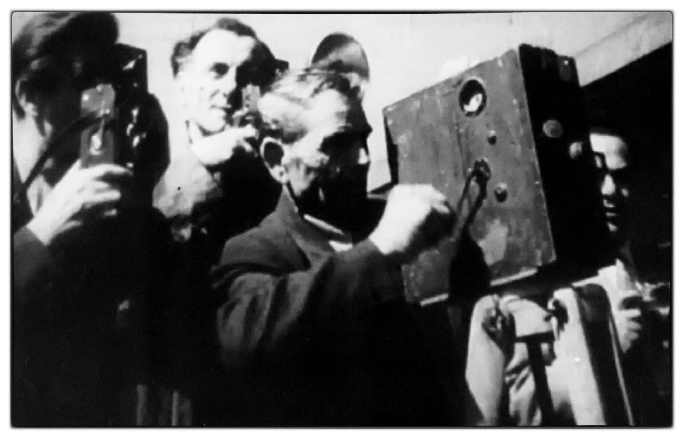 Ο Μίλτος Μανάκιας, με τη μηχανή που ξεκίνησε μαζί με τον αδελφό του τον κινηματογράφο στα Βαλκάνια. Γύρω του ομάδα Γιουγκοσλάβων φωτορεπόρτερ σε μια εκδήλωση προς τιμήν του (1955). (Φωτ.: από το βιβλίο «Τα φωτογενή Βαλκάνια των Αδελφών Μανάκη» του Χρ. Χριστοδούλου).