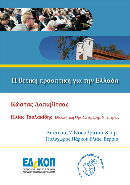 Το Ευρωπαϊκό Δίκτυο Ερευνών Κοινωνικής και Οικονομικής Πολιτικής (ΕΔΕΚΟΠ, EReNSEP) σας προσκαλεί σε δημόσια εκδήλωση με τίτλο “Η Θετική Προοπτική για την Ελλάδα”, Δευτέρα 7 Νοεμβρίου, στον Πολυχώρο Πάρκου Ελιάς στην Βέροια.