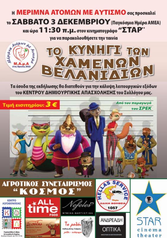 Η Μέριμνα Ατόμων με Αυτισμό σας προσκαλεί στο κινηματογράφο Σταρ το Σάββατο 3 Δεκεμβρίου και ώρα 11:30 π.μ για να παρακολουθήσετε τη ταινία ‘ΤΟ ΚΥΝΗΓΙ ΤΩΝ ΧΑΜΕΝΩΝ ΒΕΛΑΝΙΔΙΩΝ’. Τιμή εισιτηρίου 3 ευρώ.
