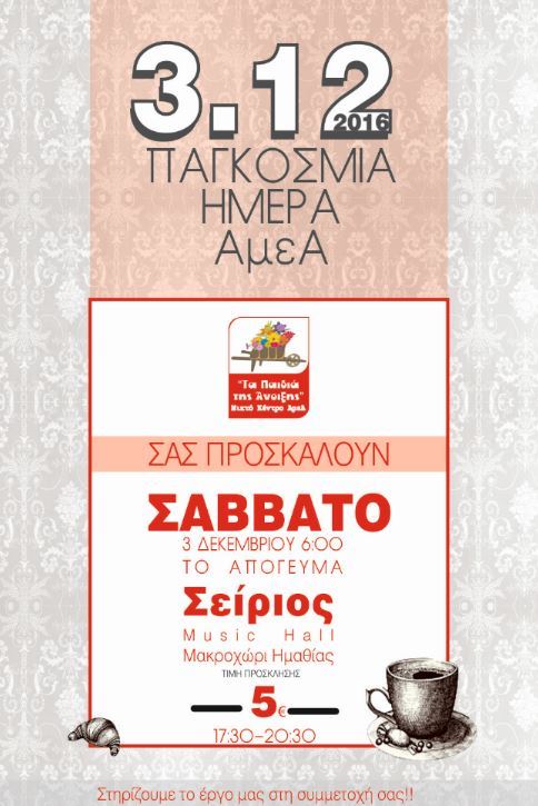 Ο Φιλανθρωπικός, μη Κερδοσκοπικός Σύλλογος Γονέων & Κηδεμόνων ΑμεΑ Ν., για να τιμήσει την Παγκόσμια Ημέρα Ατόμων με Ειδικές Ανάγκες που είναι το Σάββατο 3/12, σας προσκαλεί στο MUSIC HALL « ΣΕΙΡΙΟΣ » στο Μακροχώρι από τις 5:30 – 8:30, για μια απογευματινή εκδήλωση γεμάτη κέφι και αγάπη από τα παιδιά.