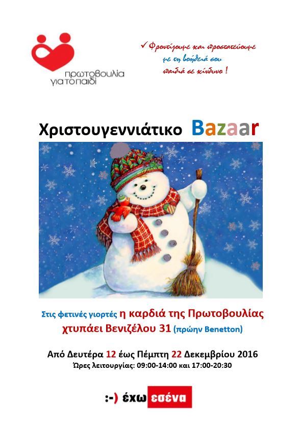 Η Πρωτοβουλία για το Παιδί πιστή στο ραντεβού της, ανακοινώνει το Χριστουγεννιάτικο Bazaar της, που θα γίνει από τη Δευτέρα 12 έως και την Πέμπτη 22 Δεκεμβρίου 2016, στη Βενιζέλου 31 (πρώην κατάστημα Benetton).