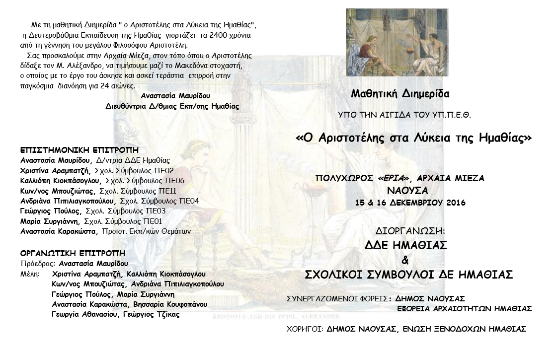 Η ΔΔΕ Ημαθίας σε συνεργασία με τους Σχολικούς Συμβούλους Ημαθίας διοργανώνει μαθητική Διημερίδα στις 15 και 16 Δεκεμβρίου με αφορμή το «Επετειακό έτος Αριστοτέλη». Η Διημερίδα θα πραγματοποιηθεί στη Νάουσα και στην αρχαία Μίεζα, στον τόπο όπου ο Αριστοτέλης δίδαξε τον Μέγα Αλέξανδρο.