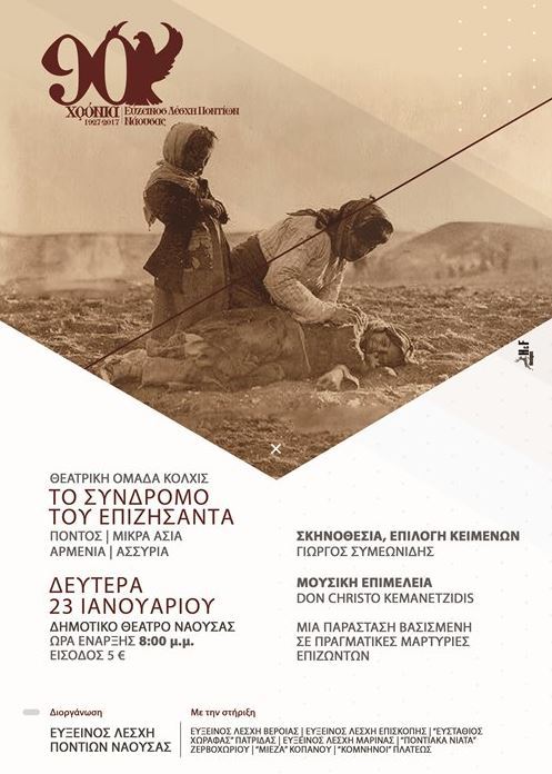 Την Θεατρική Παράσταση “Το Σύνδρομο του Επιζήσαντα”, από την Θεατρική Ομάδα Κολχίς, θα παρουσιάσει η Εύξεινος Λέσχη Ποντίων Νάουσας την Δευτέρα 23 Ιανουαρίου και ώρα 8:00 μ.μ., στο Δημοτικό Θέατρο Νάουσας.