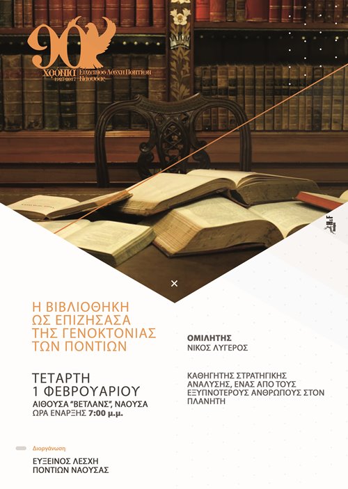 Η Εύξεινος Λέσχη Ποντίων Νάουσας διοργανώνει ομιλία με θέμα «Η Βιβλιοθήκη ως επιζήσασα της Γενοκτονίας των Ποντίων» με ομιλητή τον κ. Λυγερό Νίκο, που θα πραγματοποιηθεί την Τετάρτη 1 Φεβρουαρίου και ώρα 7:00 μ.μ., στην αίθουσα «ΒΕΤΛΑΝΣ». Ο κ. Λυγερός είναι πολυπράγμονας ερευνητής, Στρατηγικός αναλυτής και ένας από τους εξυπνότερους ανθρώπους στον κόσμο. Η παρουσία σας θα μας τιμήσει ιδιαίτερα.