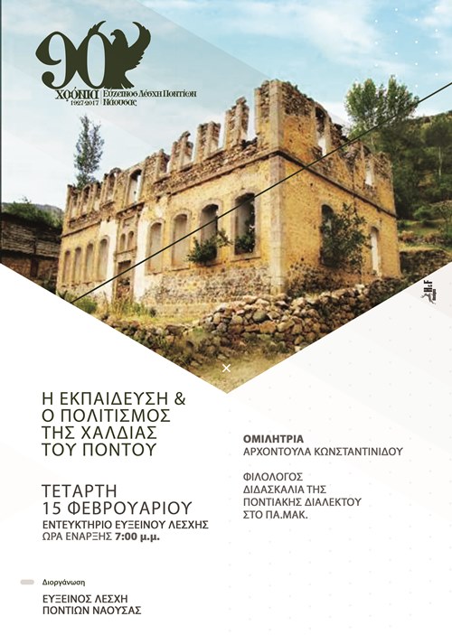 Η Εύξεινος Λέσχη Ποντίων Νάουσας διοργανώνει ομιλία με θέμα «Η Εκπαίδευση και ο Πολιτισμός στην περιοχή της Χαλδίας του Πόντου» με ομιλήτρια την κα. Κωνσταντινίδου Αρχοντούλα, που θα πραγματοποιηθεί την Τετάρτη 15 Φεβρουαρίου και ώρα 7:00 μ.μ., στο εντευκτήριο του συλλόγου. Η κυρία Κωνσταντινίδου είναι φιλόλογος και διδάσκει την Ποντιακή διάλεκτο στο Πανεπιστήμιο Μακεδονίας.