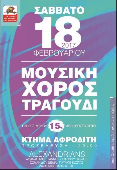 Θα διασκεδάσουμε με το συγκρότημα ALEXANDRIANS με πλούσιο λαϊκό και παραδοσιακό πρόγραμμα. Το menu μας θα είναι πλήρες και το ποτό μας απεριόριστο.
