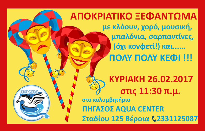 Τα μέλη και οι φίλοι του Πήγασου, σας προσκαλούν σε ένα αποκριάτικο ξεφάντωμα, με κλόουν, χορό, μουσική, μπαλόνια, σαρπαντίνες (όχι κονφετί!), και…. ΠΟΛΥ ΠΟΛΥ ΚΕΦΙ!