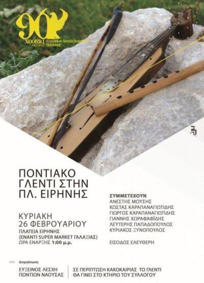 Την Κυριακή 26 Φεβρουαρίου στις 1:00 μ.μ., στην πλατεία Ειρήνης Νάουσας (έναντι Super Market Γαλαξίας), θα πραγματοποιηθεί Ποντιακό Γλέντι, από την Εύξεινο Λέσχη Ποντίων Νάουσας. Πολύ κέφι, τραγούδι και χορός με τους Ανέστη Μωυσή (Τραγούδι – Λύρα), Κώστας Καραπαναγιωτίδης (Τραγούδι), Γιώργος Καραπαναγιωτίδης (Τραγούδι), Γιάννη Χωραφαΐδη (Λύρα), Λευτέρη Παπαδόπουλο (Τραγούδι) και Κυριάκο Ξυνόπουλο (Νταούλι).