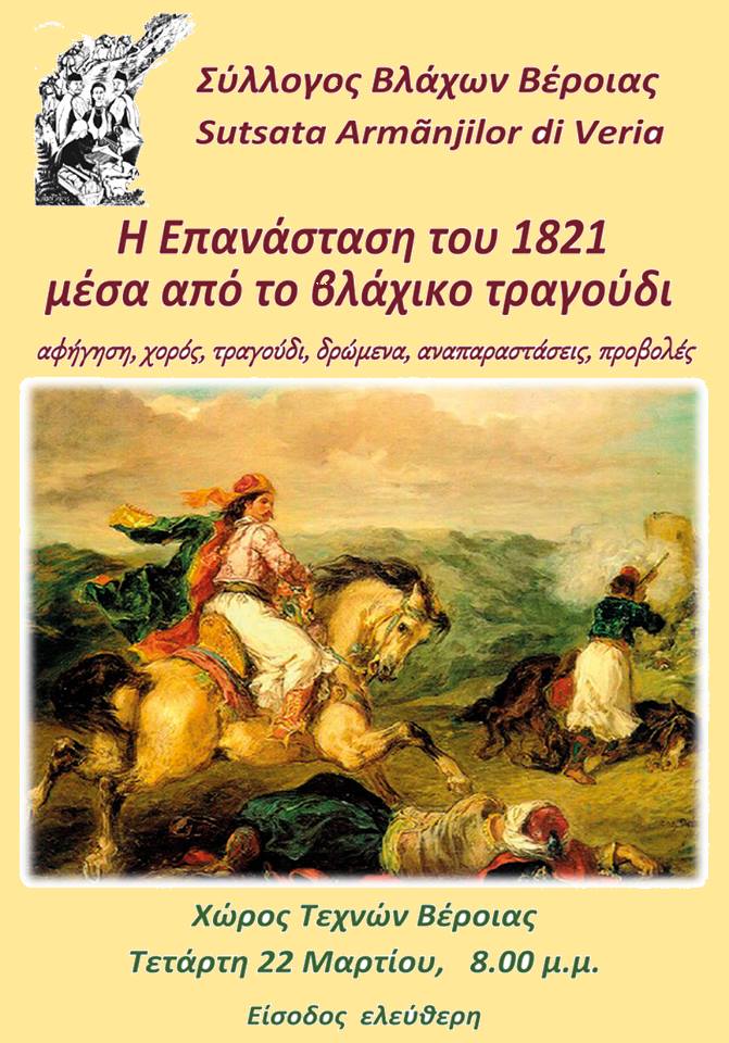 O Λαογραφικός Σύλλογος Βλάχων Βέροιας σας προσκαλεί στην εκδήλωση « Η επανάσταση του 1821 μέσα από το βλάχικο τραγούδι» , που περιλαμβάνει αφήγηση, χορό , προβολή, δρώμενα κ.α. και έχει ως κύριο θέμα τη συμβολή των Βλάχων στην Επανάσταση του 1821 μέσα από το τραγούδι.