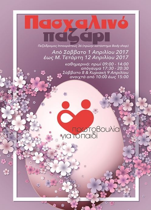 Η Πρωτοβουλία για το Παιδί πιστή στο ραντεβού της, ανακοινώνει το Πασχαλιάτικο Bazaar της, που θα γίνει από το Σάββατο 1 έως και την Μεγάλη Τετάρτη 12 Απριλίου 2017, στο πρώην κατάστημα Body Shop, Ιπποκράτους 36 (δίπλα στο «Μανιτάρι»).