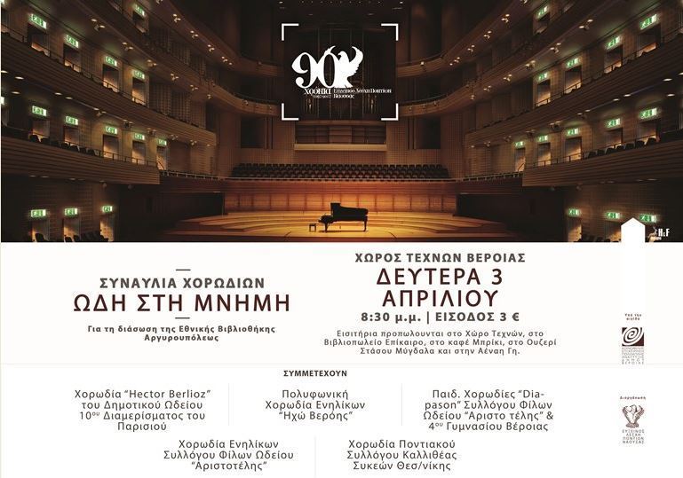 Η Εύξεινος Λέσχη Ποντίων Νάουσας διοργανώνει συναυλία χορωδιών αφιερωμένη στα 90 χρόνια ζωής του συλλόγου, με τίτλο «Ωδή στη Μνήμη». Η εκδήλωση θα πραγματοποιηθεί τη Δευτέρα 3 Απριλίου και ώρα 8:30 μ.μ. στο Χώρο Τεχνών Δήμου Βέροιας. Συμμετέχουν η Χορωδία “Hector Berlioz” του Δημοτικού Ωδείου 10ου Διαμερίσματος του Παρισιού, η Πολυφωνική Χορωδία «Ηχώ Βερόης», η Χορωδία Ενηλίκων του Συλλόγου Φίλων Ωδείου «Αριστοτέλης», η παιδική χορωδία “Diapason” μαζί με το 4ο Γυμνάσιο Βέροιας και η Χορωδία του Ποντιακού Συλλόγου Καλλιθέας-Συκεών Θεσσαλονίκης.