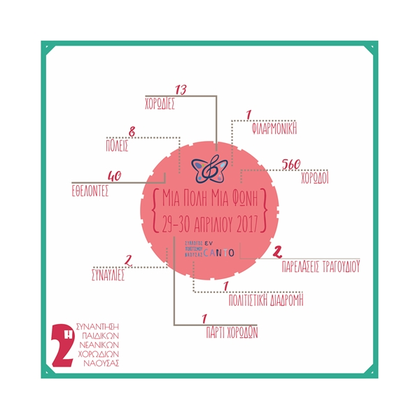 Στις 29 & 30 Απριλίου 2017 θα πραγματοποιηθεί η 2η Συνάντηση Παιδικών και Νεανικών Χορωδιών. Δεκατρείς χορωδίες από διάφορα μέρη της Ελλάδας (Νάουσα, Βέροια, Κατερίνη, Κοζάνη, Γιαννιτσά, Μηχανιώνα Θεσ/νίκης, Ν. Μάδυτος Δ. Βόλβης, Νίκαια Λάρισας,) και περισσότερα από 550 παιδιά-χορωδοί θα πλημμυρίσουν την πόλη μας με μουσικές και τραγούδια. Η πρωτοβουλία ανήκει στο Σύλλογο Πολιτισμού ενCANTO και γίνεται σε συνέχεια της περσινής πρώτης διοργάνωσης που στέφθηκε με μεγάλη επιτυχία. Η προσπάθεια πραγματοποιείται με την αρωγή του Δήμου Νάουσας- Αντιδ. Πολιτισμού και στηρίζεται στην αμέριστη συμπαράσταση εθελοντών πολιτών και των χορηγών-υποστηρικτών.