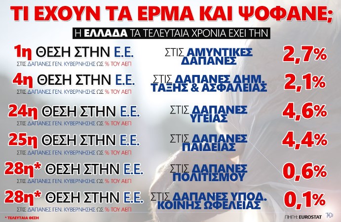Εντυπωσιάζουν τα στοιχεία της Eurostat σχετικά με τις δαπάνες της Ελλάδας σε διάφορους τομείς. Εντυπωσιάζει κυρίως η πρωτιά μας στις αμυντικές δαπάνες ως ποσοστό του ΑΕΠ, όπως και η αξιοζήλευτη, 4η θέση, για τη δημόσια τάξη και ασφάλεια, τη στιγμή μάλιστα που είμαστε ουραγοί σε δαπάνες υγείας, παιδείας, κοινωνικής ωφέλειας.