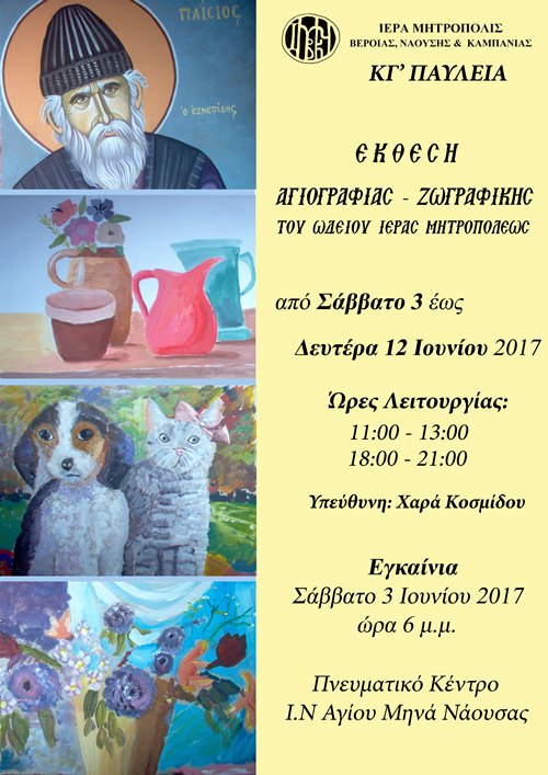 Τα εγκαίνια θα πραγματοποιηθούν το Σάββατο 3 Ιουνίου 2017 και ώρα 6 μ.μ. στο Πνευματικό Κέντρο του Ι. Ν Αγίου Μηνά Νάουσας.
