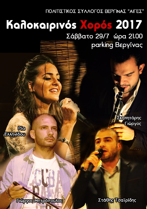 Ο Εκπολιτιστικός και Μορφωτικός Σύλλογος Βεργίνας «ΑΙΓΕΣ» σας προσκαλεί στον Καλοκαιρινό Χορό που θα γίνει το Σάββατο 29 Ιουλίου 2017 και ώρα 21.00μμ. στον χώρο του ανοικτού δημοτικού parking στη Βεργίνα.