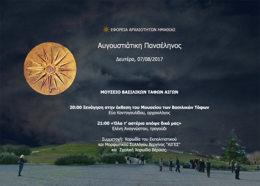 Στον αύλειο χώρο του Μουσείου Βασιλικών Τάφων των Αιγών, τη Δευτέρα 7 Αυγούστου στις 21:00 η σοπράνο Ελένη Αναγνώστου θα ερμηνεύσει με συνοδεία πιάνου τραγούδια για το φεγγάρι, ενώ μια ώρα νωρίτερα, στις 20:00, η επιμελήτρια των Αιγών, αρχαιολόγος Εύα Κοντογουλίδου θα ξεναγήσει το κοινό στην έκθεση του Μουσείου.