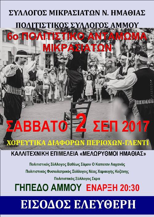 Βέροια Εκδηλώσεις 6ο Πολιτιστικό Αντάμωμα Μικρασιατών. Άμμος Ημαθίας, Σάββατο 2 Σεπτεμβρίου Faretra.info 20/08/2017, 23:56 Share on Facebook Share on Twitter Send with mail Φαρέτρα 6ο Ανταμωμα Μικρασιατών Μικρασιάτες Πολιτισμος ΣΧΕΤΙΚΑ ΑΡΘΡΑ Δεν υπάρχουν σχετικά άρθρα.