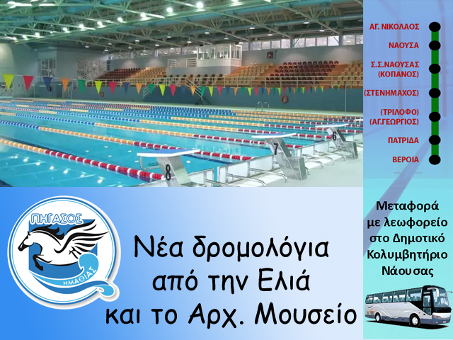 Την Δευτέρα 04 Σεπτεμβρίου άρχισαν να λειτουργούν για 4η χρονιά τα τμήματα του Πήγασου στο Δημοτικό κολυμβητήριο Νάουσας. Ο Πήγασος Ημαθίας, ο σύλλογος με την πιο καινοτόμο οργάνωση και λειτουργία στην ευρύτερη περιοχή συνεχίζει να χρησιμοποιεί για τις ανάγκες των αγωνιστικών του τμημάτων το Δημοτικό κολυμβητήριο Νάουσας. Ένα από τα καλύτερα κολυμβητήρια στην Ελλάδα για ελεύθερη και αγωνιστική κολύμβησης.