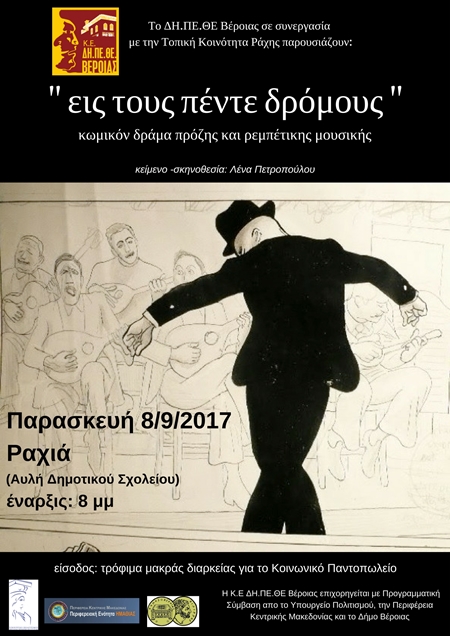 Το ΔΗ.ΠΕ.ΘΕ Βέροιας για το Καλοκαίρι 2017 κάνει περιοδεία, στις γειτονιές της Βέροιας και σε τοπικές κοινότητες του Δήμου με την παράσταση «Εις τους πέντε δρόμους» της Λένας Πετροπούλου. Οι παραστάσεις πραγματοποιούνται με τη συνεργασία των Δημοτικών Κοινοτήτων Βέροιας και Μακροχωρίου, των Τοπικών κοινοτήτων Βεργίνας, Δοβρά, Μακεδονίδος, Αποστόλου Παύλου, Ασωμάτων, Ράχης, και των Πολιτιστικών Συλλόγων «Αγίου Γεωργίου», «Διαβατού», «Προμηθέα», «Ασωμάτων», Μ.Α.Σ «Η Καλλιθέα», «Λαογραφικό Σύλλογο Ντόπιων Μακροχωρίου & Περιχώρων» «Σύλλογο Ποντίων Μακροχωρίου» και του «Μορφωτικού Πολιτιστικού Συλλόγου Βεργίνας «Αιγές».