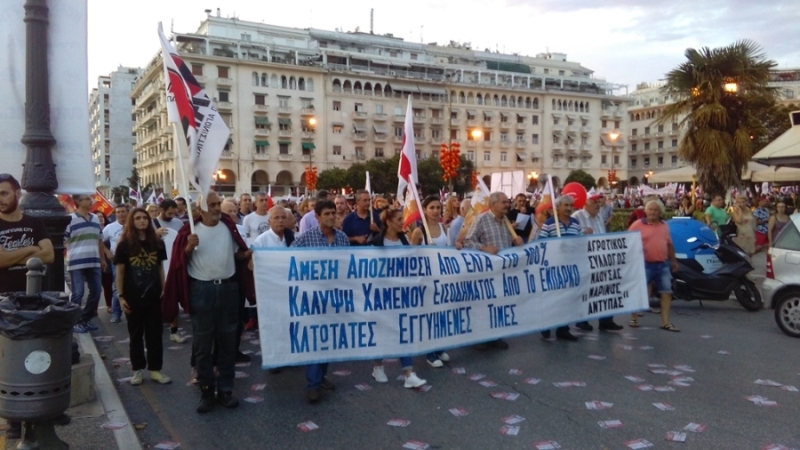 Κεντρικό σύνθημα των διαδηλωτών στην Πλατεία Αριστοτέλους και τη πορεία με κατάληξη τη Δ.Ε.Θ. : “Η ανάπτυξή τους τσακίζει τη ζωή μας, αγώνας κι αντεπίθεση η επιλογή μας”.