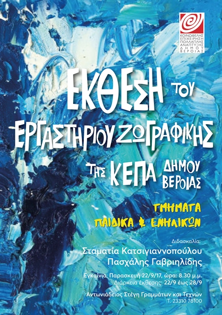 Την Παρασκευή 22 Σεπτεμβρίου 2017 στις 20:30μ.μ. εγκαινιάζεται στο Φουαγιέ του Χώρου Τεχνών η ομαδική έκθεση ζωγραφικής του τμήματος Ζωγραφικής της ΚΕΠΑ Δήμου Βέροιας.