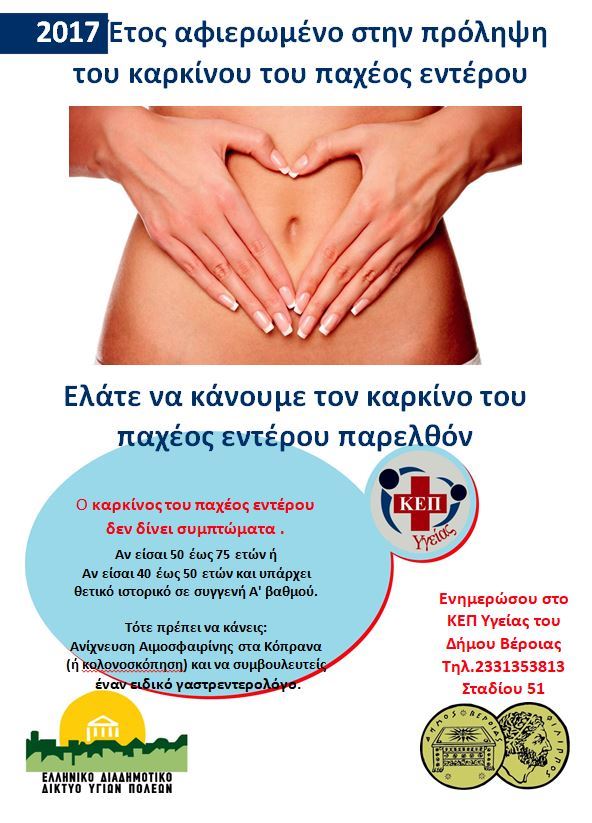Το ΚΕΠ Υγείας του Δήμου Βέροιας συμμετέχει ενεργά πανελλαδική εκστρατεία των ΚΕΠ Υγείας των Δήμων του Ελληνικού Διαδημοτικού Δικτύου Υγιών Πόλεων για την πρόληψη του Καρκίνου του παχέος εντέρου.
