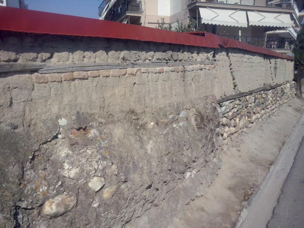 Κατασκευάστηκε µε δεξιοτεχνία και με υλικά που ήταν εύκολα να βρεθούν εκείνη την εποχή, τα οποία χρειάζονταν έως και ελάχιστη επεξεργασία ή μεταφορά και επομένως τα οικονομικά και περιβαλλοντολογικά κόστη ήταν χαμηλά (με χαμηλό αντίκτυπο στο περιβάλλον). Δεν πρέπει να μας ξεφεύγει της προσοχής και η σταθερότητα της τοιχοποιίας η οποία εξαρτάται σε μεγάλο βαθμό, όχι τόσο από τα υλικά που χρησιμοποιηθήκαν, όσο από τον τρόπο που τοποθετούνται στην κατασκευή. Ο τοίχος είναι κτισμένος με λιθόκτιστα θεμέλια και πλινθόκτιστη ανωδομή, έχει μήκος 24μ., υψος2,2μ και πάχος 0,7μ.. Επίσης η πρόσοψη του τοίχου μπορεί να χωριστεί σε τέσσερα μέρη με βάση την διαφορετική εικόνα της φέρουσας τοιχοποιίας