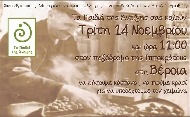 Αλεξάνδρεια Βέροια Εκδηλώσεις Κάλεσμα από “Τα Παιδιά της Άνοιξης” στον Πεζόδρομο της Ιπποκράτους στη Βέροια Faretra.info 10/11/2017, 19:11 Share on Facebook Share on Twitter Send with mail Φαρέτρα κάστανα Παιδιά της Άνοιξης ΣΧΕΤΙΚΑ ΑΡΘΡΑ Δεν υπάρχουν σχετικά άρθρα.