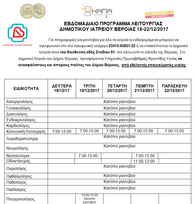 Βέροια Ειδήσεις με Διάρκεια Δημοτικό Ιατρείο Βέροιας. Πρόγραμμα λειτουργίας από 18 έως και 22 Δεκεμβρίου Faretra.info 15/12/2017, 10:51 Share on Facebook Share on Twitter Send with mail Φαρέτρα ΣΧΕΤΙΚΑ ΑΡΘΡΑ Δεν υπάρχουν σχετικά άρθρα.