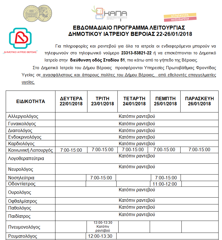 Βέροια Ειδήσεις με Διάρκεια Δημοτικό Ιατρείο Βέροιας. Πρόγραμμα λειτουργίας από 22 έως και 26 Ιανουαρίου 2018 Faretra.info 21/01/2018, 18:06 Share on Facebook Share on Twitter Send with mail Φαρέτρα ΣΧΕΤΙΚΑ ΑΡΘΡΑ Δεν υπάρχουν σχετικά άρθρα.