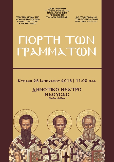 Το Σωματείο και το Πανελλήνιο Ιερό Προσκύνημα «ΠΑΝΑΓΙΑ ΣΟΥΜΕΛΑ», σε συνεργασία με την Εύξεινο Λέσχη Ποντίων Νάουσας και υπό την αιγίδα την Ιεράς Μητροπόλεως Βεροίας, Ναούσης και Καμπανίας, διοργανώνουν την Γιορτή των Γραμμάτων, με αφορμή τον εορτασμό των Τριών Ιεραρχών, για την βράβευση μαθητών των Δημοτικών Σχολείων και Πολιτιστικών Σωματείων της Νάουσας.