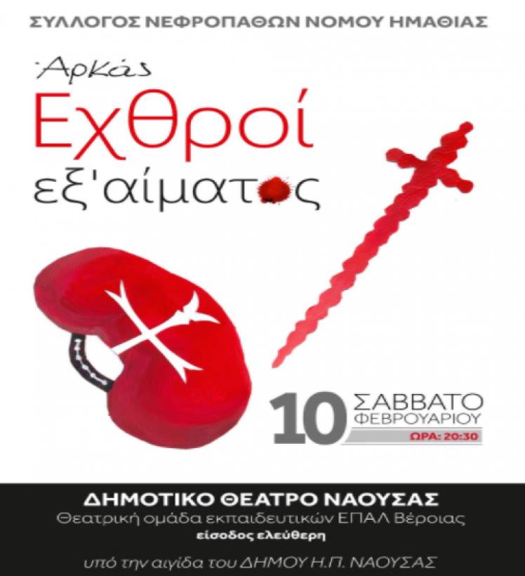 Το Σάββατο 10 Φεβρουαρίου και ώρα 8.30 στο Δημοτικό Θέατρο Νάουσας θα δοθεί η παράσταση «Εχθροί εξ αίματος» του Αρκά σε συνδιοργάνωση με το Σύλλογο Νεφροπαθών Νομού Ημαθίας και υπό την αιγίδα του Δήμου Η. Π. Νάουσας.