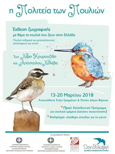 Οι Διευθύνσεις Πρωτοβάθμιας και Δευτεροβάθμιας Εκπαίδευσης Ημαθίας, η Ελληνική Ορνιθολογική Εταιρεία και η ΚΕΠΑ Δήμου Βέροιας, φιλοξενούν την έκθεση ζωγραφικής των Απόστολου Χολέβα και Χάρη Κουρουζίδη, με τίτλο: «Η πολιτεία των πουλιών». Η έκθεση, που αφορά τα πουλιά που ζουν στην Ελλάδα, θα φιλοξενηθεί στο ισόγειο της Αντωνιάδειας Στέγης Γραμμάτων και Τεχνών Δήμου Βέροιας, από την Τρίτη 13 έως και την Τρίτη 20 Μαρτίου 2018.