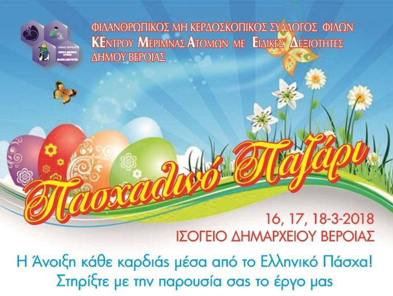 Βέροια Εκδηλώσεις Το Πασχαλινό Παζάρι του ΚΕΜΑΕΔ, έναρξη Παρασκευή 16 Μαρτίου Faretra.info 15/03/2018, 09:28 Share on Facebook Share on Twitter Send with mail Φαρέτρα ΚΕΜΑΕΔ Πασχαλινό Παζάρι ΣΧΕΤΙΚΑ ΑΡΘΡΑ Δεν υπάρχουν σχετικά άρθρα.