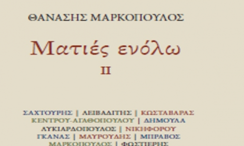 Ο Σύνδεσμος Φιλολόγων Ν. Ημαθίας, οι Εκδόσεις Μελάνι και το βιβλιοπωλείο «Ηλιοτρόπιο» παρουσιάζουν τα δοκίμια του Θανάση Μαρκόπουλου Ματιές ενόλω ΙΙ την Τετάρτη 21 Μαρτίου 2018 στις 7 μ.μ. στον πολυχώρο της «Ελιάς» (Βέροια). Για το βιβλίο θα μιλήσουν η Έφη Λιακοπούλου, φιλόλογος του 5ου Γενικού Λυκείου Βέροιας, ο Παντελής Τσαλουχίδης, φιλόλογος και κριτικός λογοτεχνίας, κι ο συγγραφέας, ενώ την εκδήλωση θα συντονίσει η πρόεδρος του Συνδέσμου Φιλολόγων Ευγενία Καβαλλάρη.
