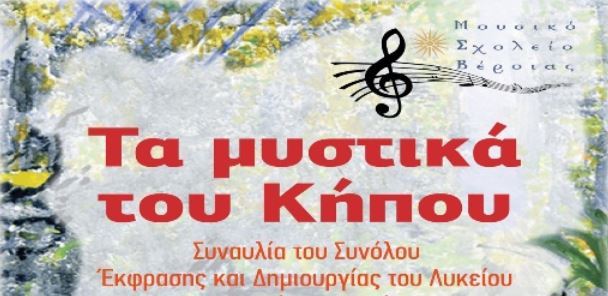Το Μουσικό Σχολείο Βέροιας και ο Σύλλογος Γονέων και Κηδεμόνων σας προσκαλούν στη συναυλία του ΣΥΝΟΛΟΥ ΕΚΦΡΑΣΗΣ ΚΑΙ ΔΗΜΙΟΥΡΓΙΑΣ με τίτλο «Τα μυστικά του κήπου» με αποσπάσματα από τον ομώνυμο δίσκο του Νίκου Κυπουργού που θα λάβει χώρα στην Αντωνιάδειο Στέγη Γραμμάτων και Τεχνών του Δήμου Βέροιας , την Τετάρτη 18 Απριλίου 2018 και ώρα 8.30 μ.μ.