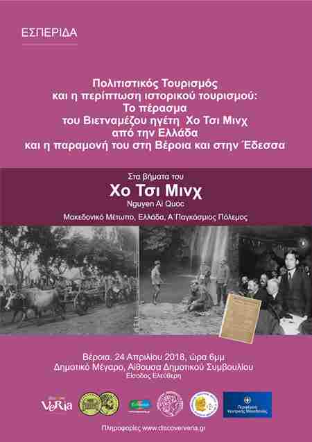 Εσπερίδα με τίτλο «Πολιτιστικός Τουρισμός και η Περίπτωση Ιστορικού Τουρισμού: Το πέρασμα του Βιετναμέζου ηγέτη Χο Τσι Μινχ από την Ελλάδα και η παραμονή του στη Βέροια και στην Έδεσσα» διοργανώνει η Αντιδημαρχεία Τουρισμού Βέροιας την Τρίτη 24 Απριλίου 2018 στις 18.00 στην αίθουσα του Δημοτικού Συμβουλίου Βέροιας.