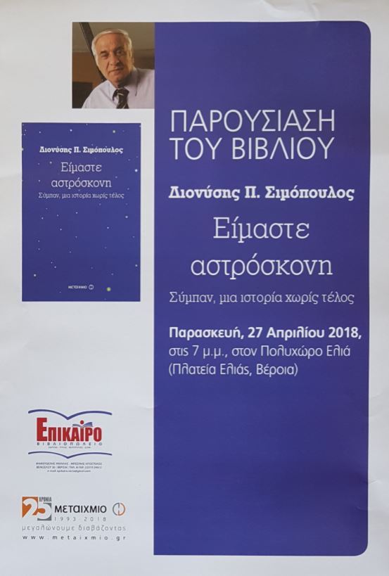 Βέροια Εκδηλώσεις Βιβλιοπαρουσίαση στη Βέροια. Διονύσης Σιμόπουλος “Είμαστε αστρόσκονη”, Παρασκευή 27 Απριλίου Faretra.info 23/04/2018, 13:13 Share on Facebook Share on Twitter Send with mail Φαρέτρα Βιβλιοπαρουσίαση Διονύσης Σιμόπουλος ΣΧΕΤΙΚΑ ΑΡΘΡΑ Δεν υπάρχουν σχετικά άρθρα.