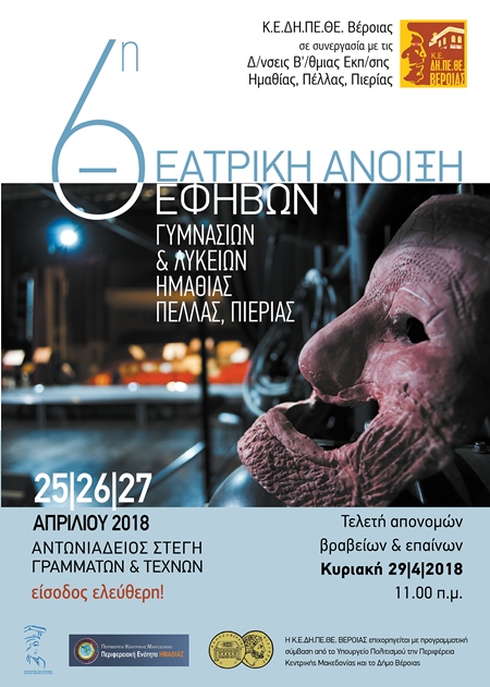 Το Δημοτικό Περιφερειακό Θέατρο Βέροιας σε συνεργασία με τις Διευθύνσεις Δευτεροβάθμιας Εκπαίδευσης Ημαθίας, Πιερίας, Πέλλας & και υπό την αιγίδα του Υπουργείου Παιδείας διοργανώνουν την 6η Θεατρική Άνοιξη Εφήβων Γυμνασίων & Λυκείων Ημαθίας, Πιερίας και Πέλλας από την Τετάρτη 25 έως και την Παρασκευή 28 Απριλίου 2018 στην Αντωνιάδειο Στέγη Γραμμάτων & Τεχνών στη Βέροια.