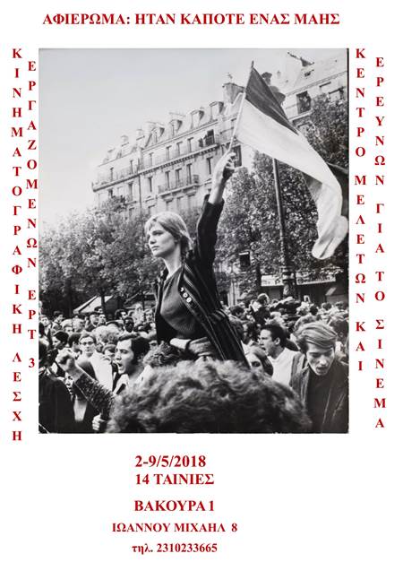 Η Κινηματογραφική Λέσχη των Εργαζομένων της ΕΡΤ3 και το Κέντρο Μελετών και Ερευνών για το Σινεμά (ΚΕ.Μ.Ε.Σ.) τιμούν τα 50 χρόνια από τα γεγονότα του Γαλλικού Μάη του ’68, θεωρώντας ότι υπήρξαν ένα κορυφαίο ιδεολογικό και πολιτιστικό σταυροδρόμι στην ιστορία του 20ου αιώνα, με ένα κινηματογραφικό αφιέρωμα 14 ταινιών στον κινηματογράφο ΒΑΚΟΥΡΑ 1, από τις 2 έως και τις 9 Μαῒου. Πρώτη προβολή του αφιερώματος την Τετάρτη 2/5 στις 19:30 με το αριστούργημα του Σέρτζιο Λεόνε ΚΑΤΩ ΤΑ ΚΕΦΑΛΙΑ, ενώ από τις 22:00 ως τις 22:15 θα γίνει η επίσημη έναρξη με συνοδεία γαλλικών εδεσμάτων, και στη συνέχεια θα επακολουθήσει και η προβολή της δεύτερης ταινίας Ο ΜΙΛΟΥ ΤΟΝ ΜΑΗ. Η είσοδος πέραν των εισιτηρίων θα γίνεται και με ειδική εκπτωτική κάρτα και για τις 14 ταινίες. Οι οργανωτές συνιστούν, λόγω του περιορισμένου αριθμού των καρτών, την έγκαιρη προμήθεια τους από τους αρμοδίους. Χορηγός επικοινωνίας ο ραδιοφωνικός σταθμός 93,4 Στο Κόκκινο. Πρόλογοι, κριτικές, αναλύσεις ειδικών και συζητήσεις θα συνοδεύουν αυτό το αφιέρωμα, του οποίου το ακριβές πρόγραμμα είναι το ακόλουθο: