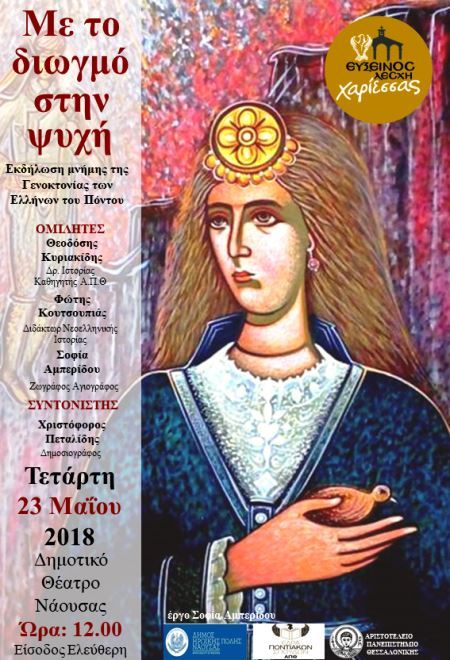 H Εύξεινος Λέσχη Χαρίεσσας Δ. Νάουσας διοργανώνει σε συνεργασία και την Έδρα Ποντιακών Σπουδών του Αριστοτέλειο Πανεπιστήμιου Θεσσαλονίκης και τον Δήμο Ηρωικής Πόλης Νάουσας εκδήλωση για την Γενοκτονία των Ελλήνων του Πόντου με τίτλο «Με τον διωγμό στην Ψυχή» που θα λάβει χώρα την Τετάρτη 23 Μάϊου 2018 στις 12:00 το μεσημέρι στο δημοτικό θέατρο Νάουσας.