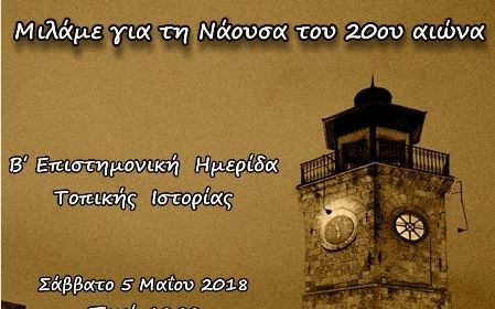 Η Εταιρεία Μελετών Ιστορίας και Πολιτισμού Ν. Ημαθίας σε συνεργασία με το Δήμο Νάουσας και την Πολιτιστική Εταιρεία Ναούσης Μιχαήλ ο Λόγιος διοργανώνουν την Β΄ Επιστημονική Ημερίδα Τοπικής Ιστορίας «Μιλάμε για τη Νάουσα του 20ου αιώνα».