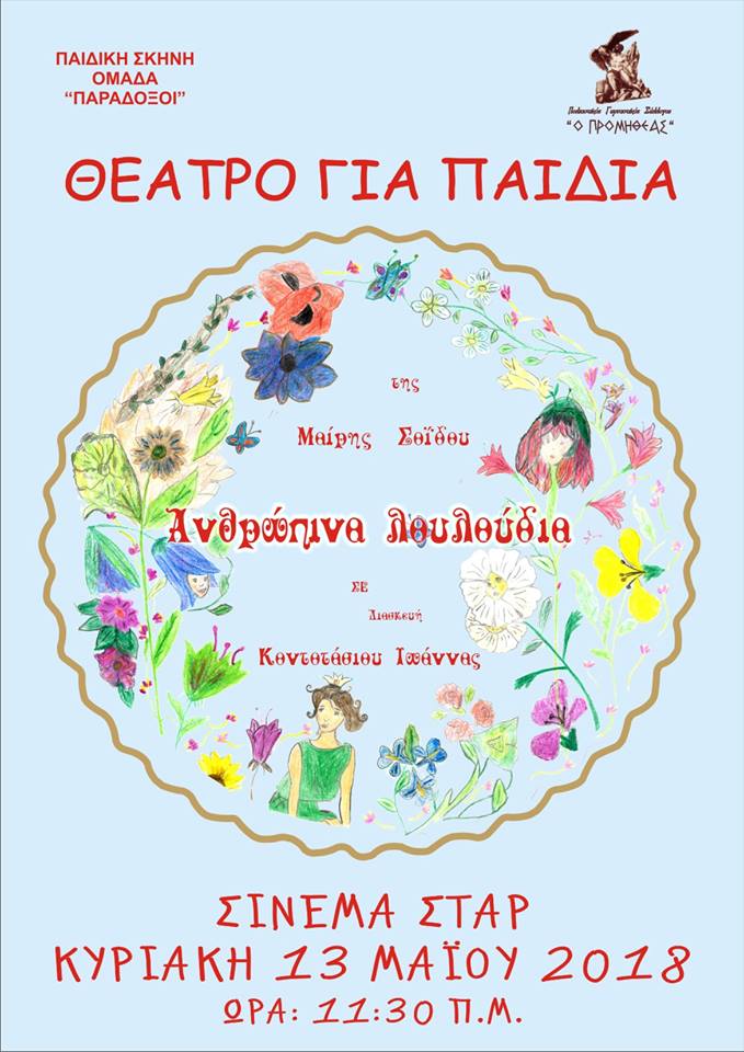 Τα σκανταλιάρικα ξωτικά της παιδικής σκηνής του Π.Γ.Σ. “Ο Προμηθέας” πρόκειται να παρουσιάσουν το παραμυθόδραμα της Μαίρης Σοΐδου “ΑΝΘΡΩΠΙΝΑ ΛΟΥΛΟΥΔΙΑ”, την Κυριακή 13 Μαΐου 2018 και ώρα 11.30 πμ στο ΣΤΑΡ Βέροιας. Τη διασκευή και το συντονισμό της παράστασης ανέλαβε η Ιωάννα Κοντοτάσιου.